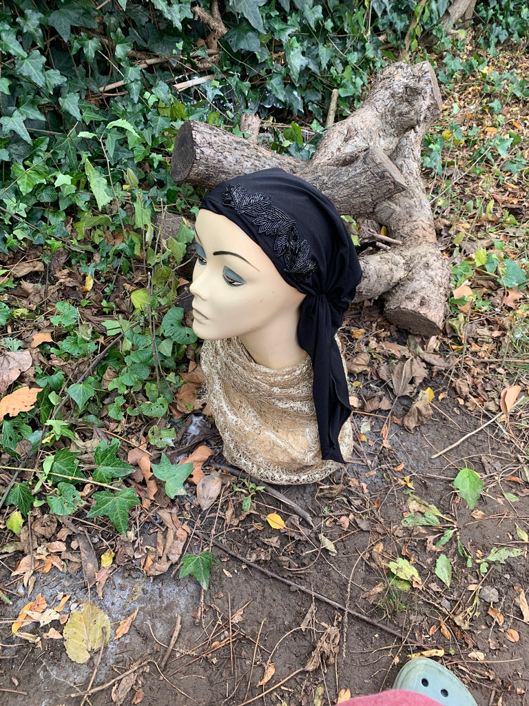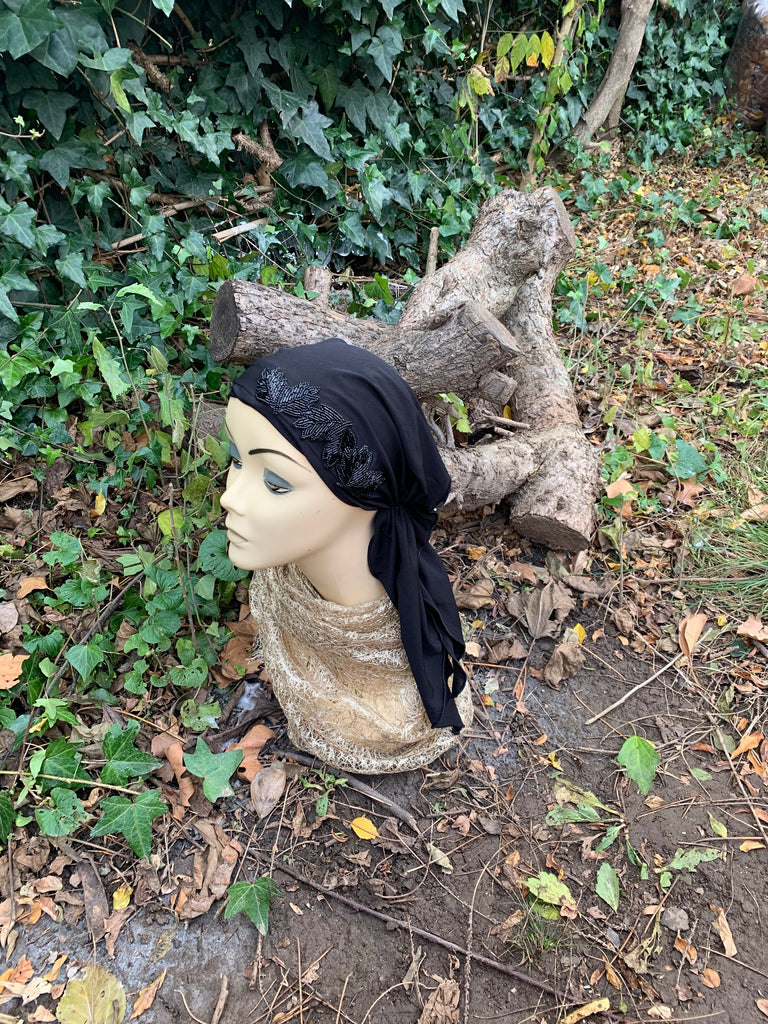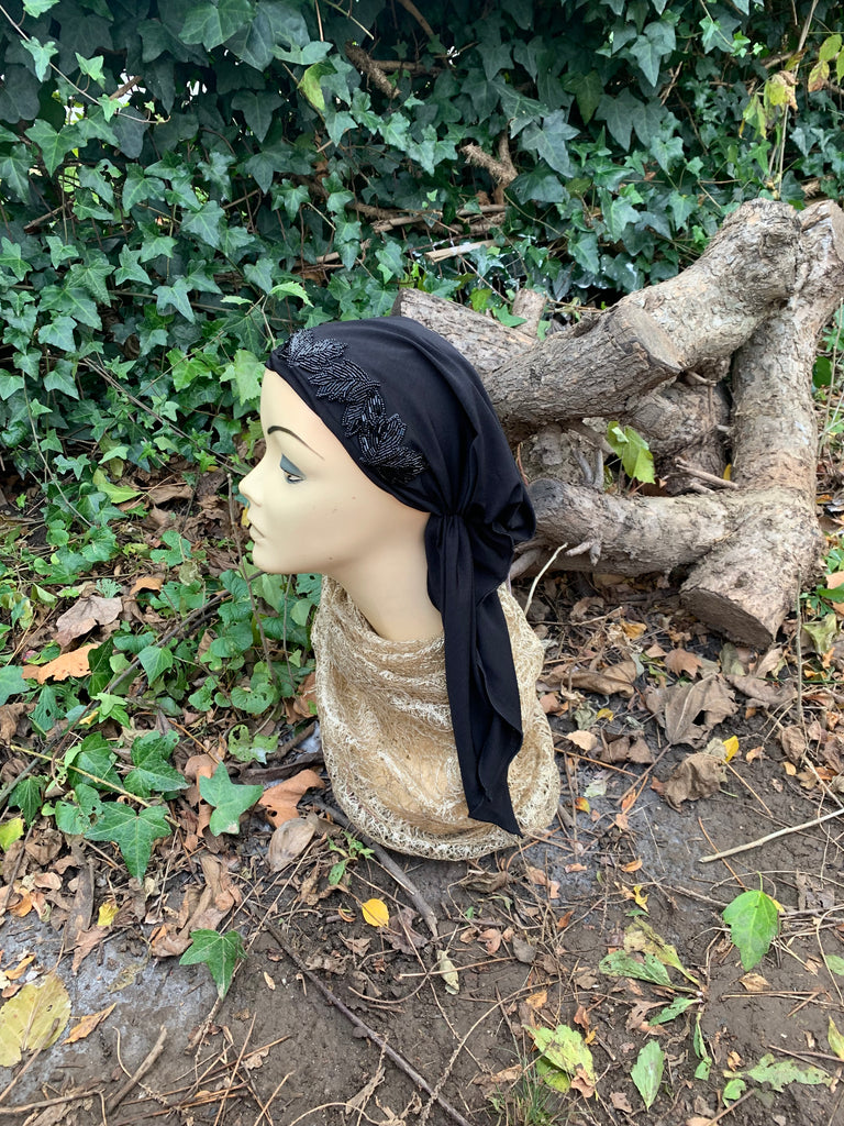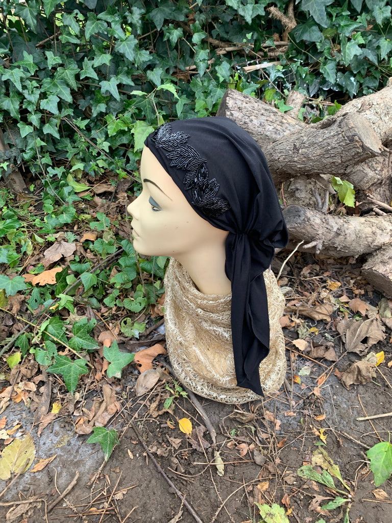 Black Pre Tied Headscarf For Women With Unique Black Sparkly Appliqué Design | Dressy or Casual | Black Modern Fitted Hijab | Made in the USA