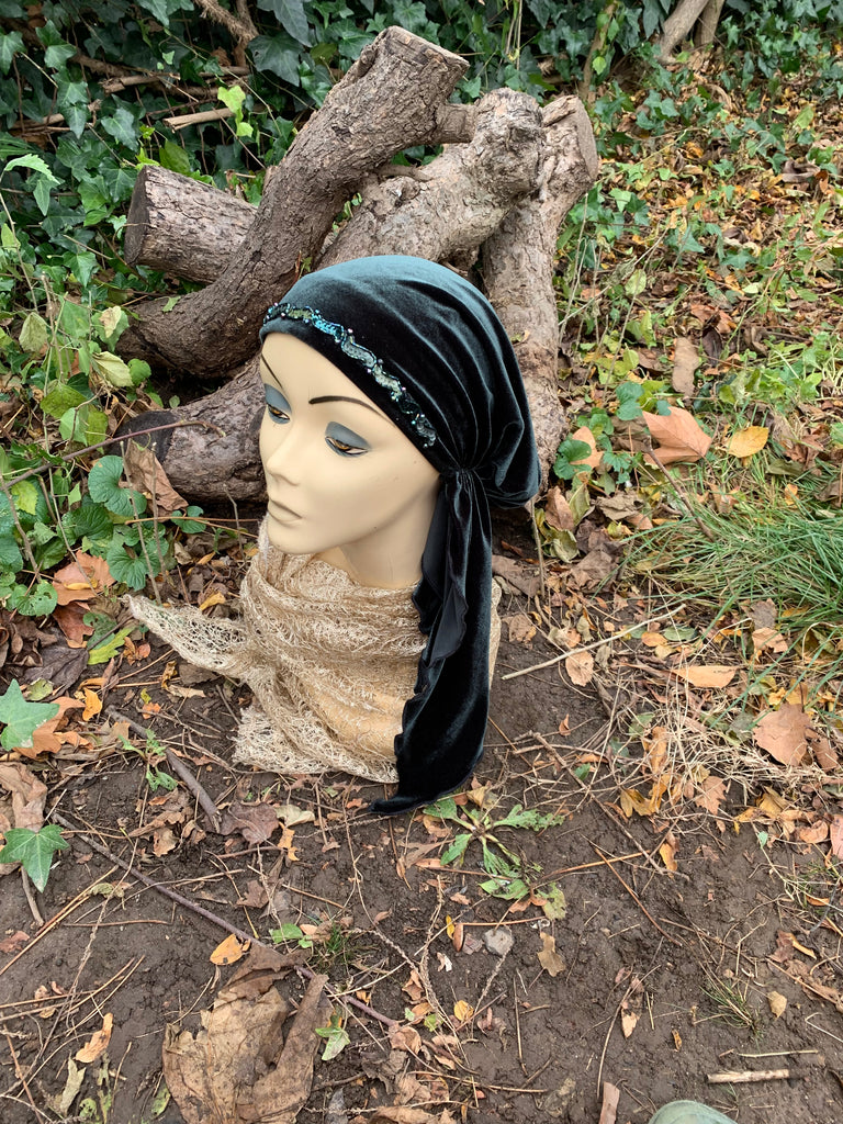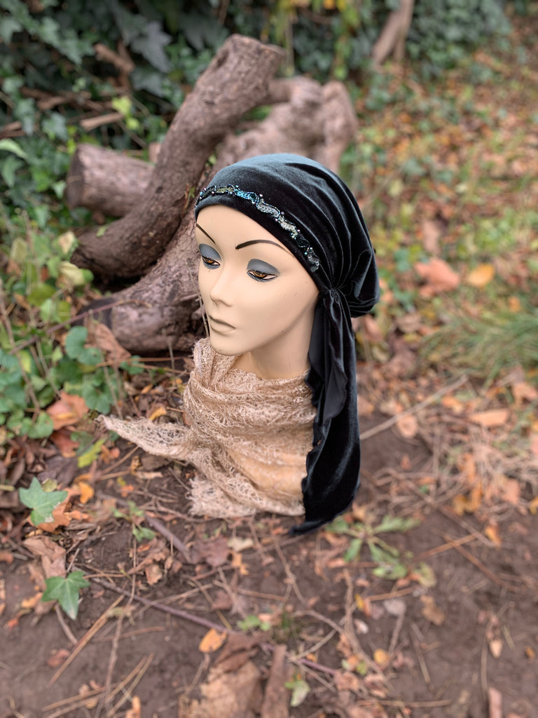 Premium Velvet Green Headscarf For Women | Comfy Stretchy Lightweight Tichel Hair Wrap Hijab Scarf With Green Sparkly Design | Made in the USA