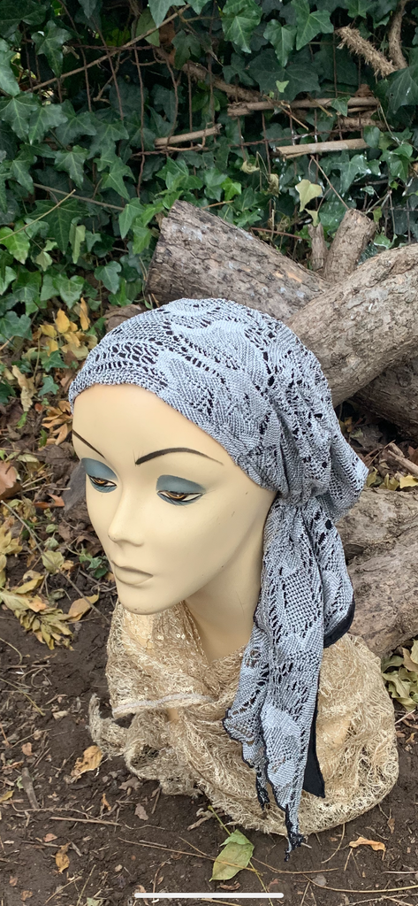 Silver Lace Pre Tied Headscarf With Lining | Tichel Hijab Headscarf by Uptown Girl Headwear